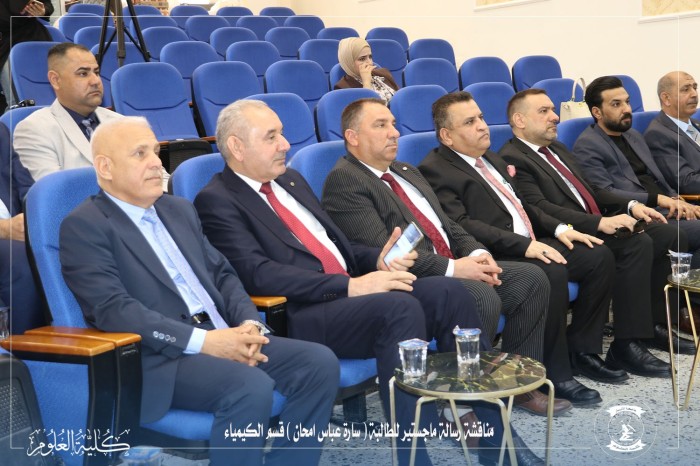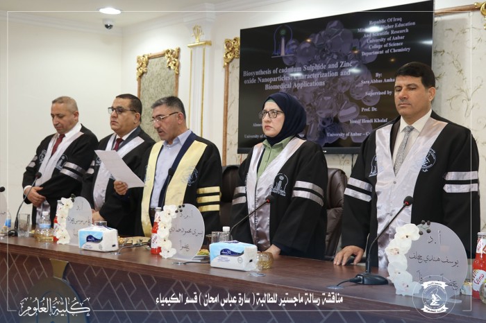جرت المناقشة العلنية لرسالة الماجستير للطالبة (ساره عباس امحان) قسم علوم الكيمياء - كلية العلوم- جامعة الأنبار يوم الاثنين الموافق 16/2/2026 على قاعة جابر بن حيان في كلية العلوم عن رسالتها الموسومة: -