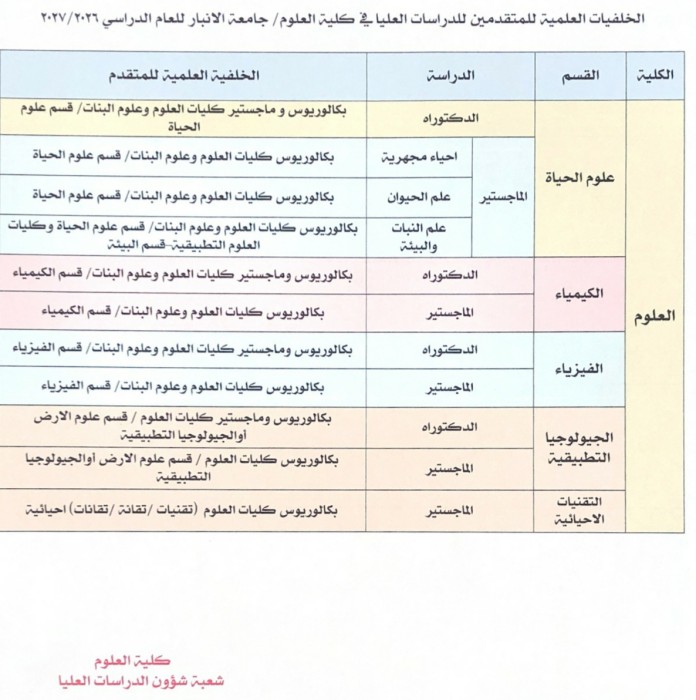 تعلن كلية العلوم عن مواد الامتحان التنافسي والخلفيات العلمية المطلوبة لكل تخصص للمتقدمين للدراسات العليا في الكلية للعام الدراسي 2026 - 2027 لبرنامجي الماجستير والدكتوراه للاقسام العلمية ( علوم الحياة والكيمياء والفيزياء والجيولوجيا التطبيقية والتقنيات الاحيائية)